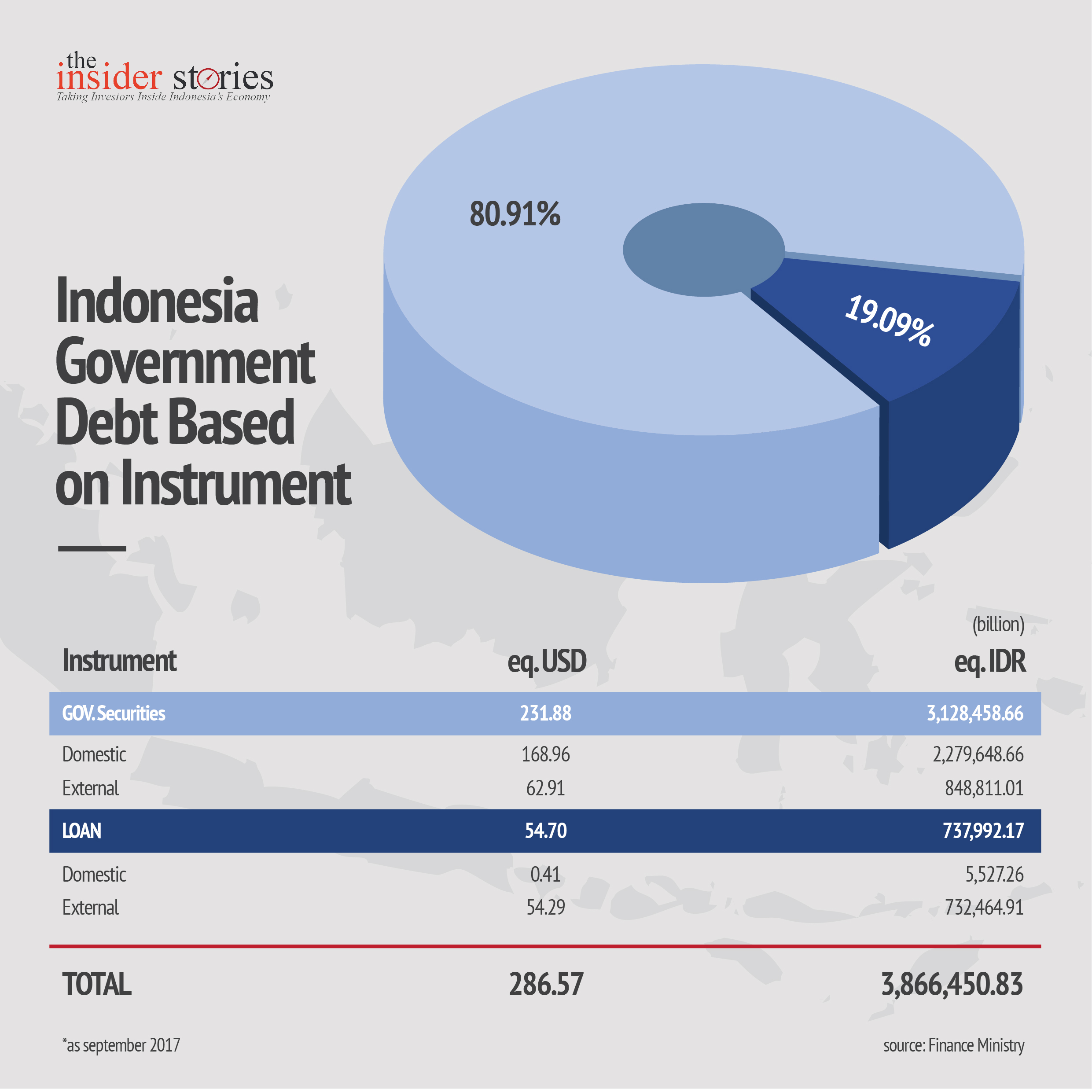 The Indonesian government’s external debt consists of bilateral and multilateral loans, export credit facilities, commercial loans, leasing and government securities owned by non-residents, issued on both foreign and domestic markets.