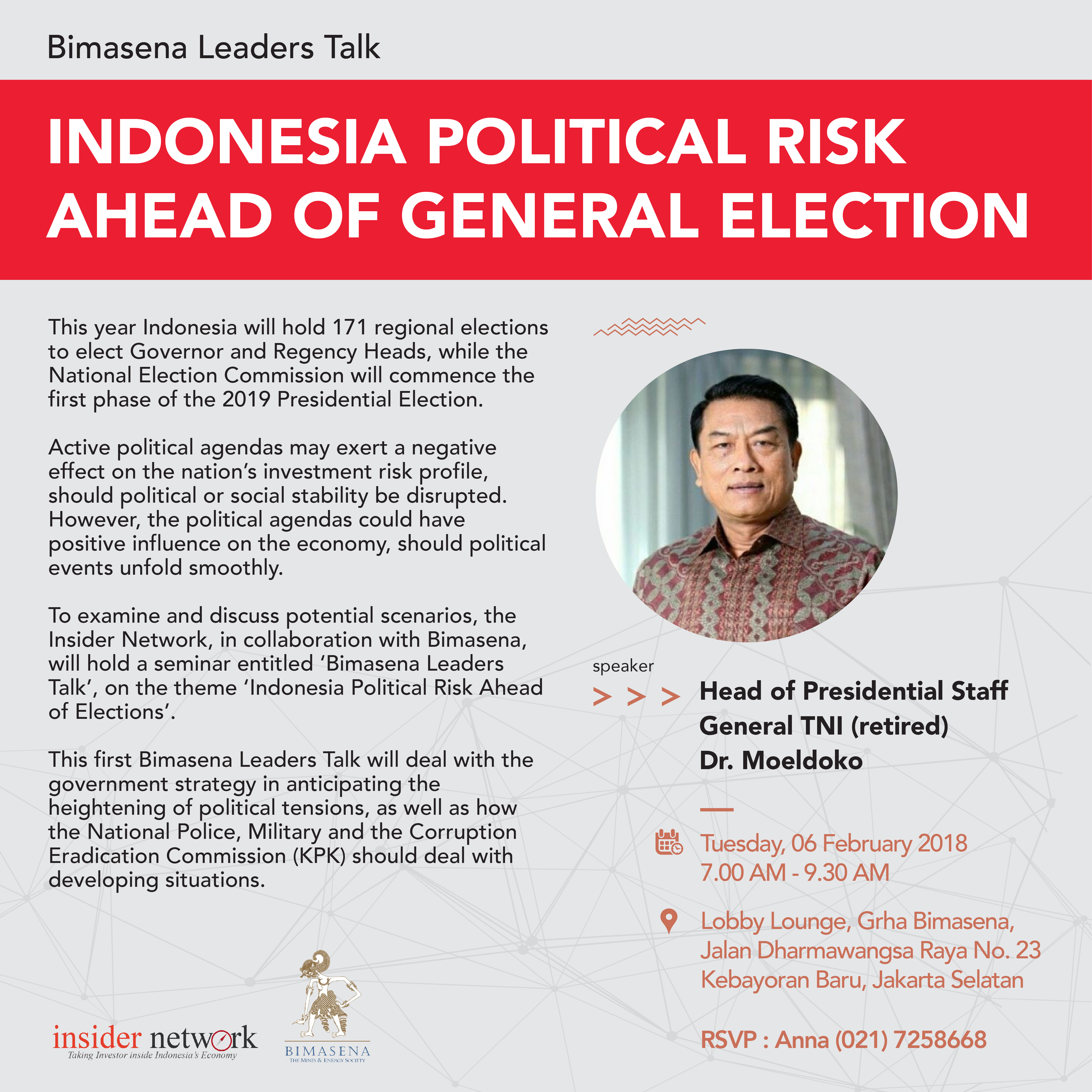 The Insider Network and Bimasena will jointly hold a public lecture, called Bimasena Leaders Talk, with a theme, ‘Indonesia Political Risk Ahead of General Election’ on Feb. 6, 2018. The speaker for the session will be the Head of Presidential Staff General TNI (ret) Moeldoko.