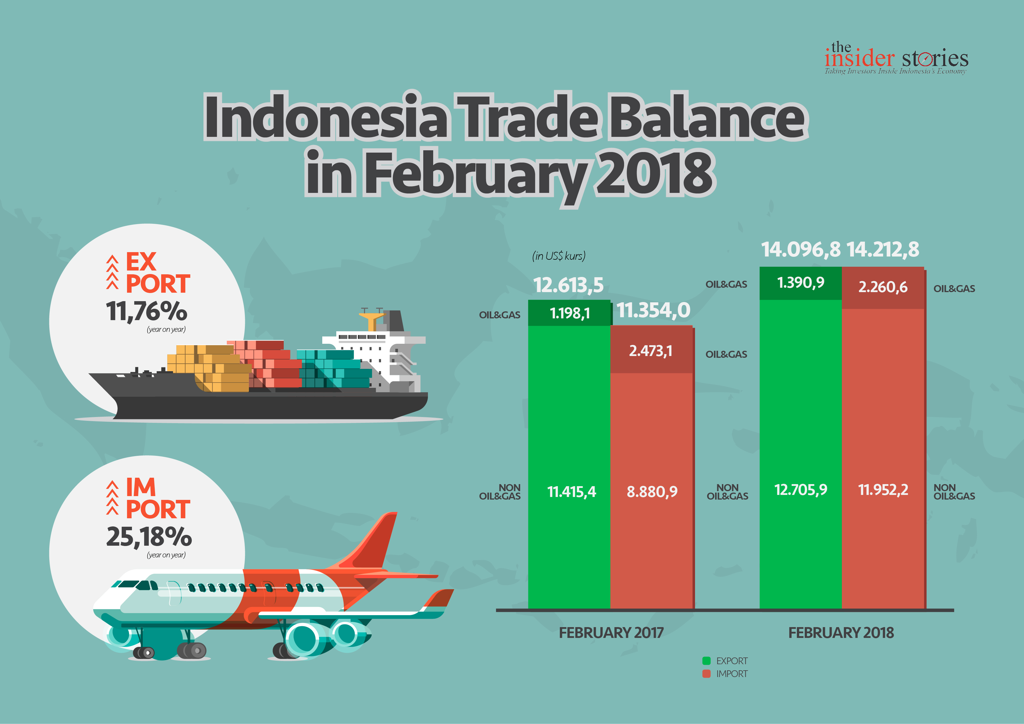 Indonesia’s exports rose 11.76 per cent at $14.10 billion, while its imports reached $14.21 billion or jumped 25.18 per cent in this mont. Cumulatively, the largest export is still contributed by mineral fuel, especially coal with a value of $3.4 billion.