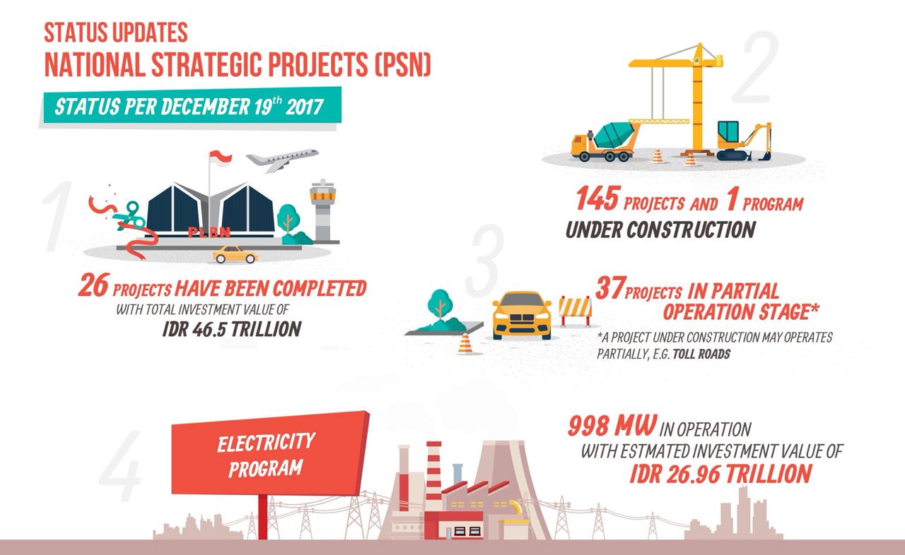 In total, all these projects together will need some Rp5,519 trillion (US$410 billion) worth of investment. As in 2017, $4.5 billion worth of infrastructure have been completed.