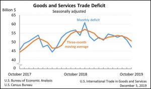 Last month, US’ competitor reported the trade surplus widened to $42.81 billion in October of 2019 from $32.97 billion in the same month a year earlier. This was the largest trade surplus since July, as exports declined 0.9 percent year-on-year, while imports dropped at a faster 6.4 percent.